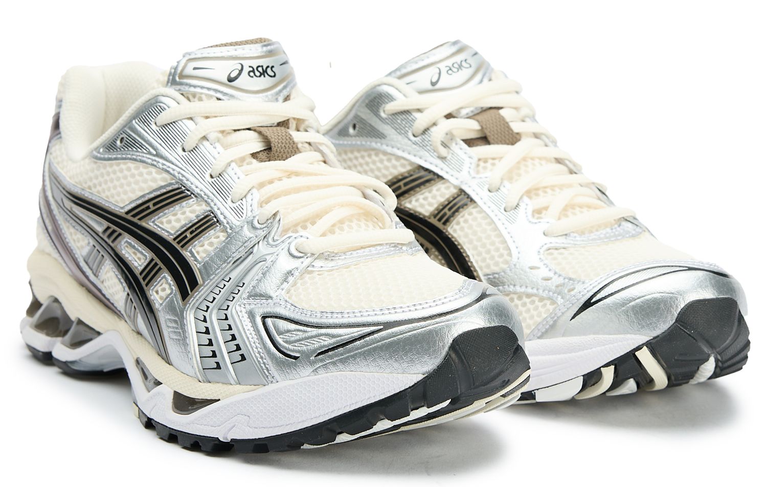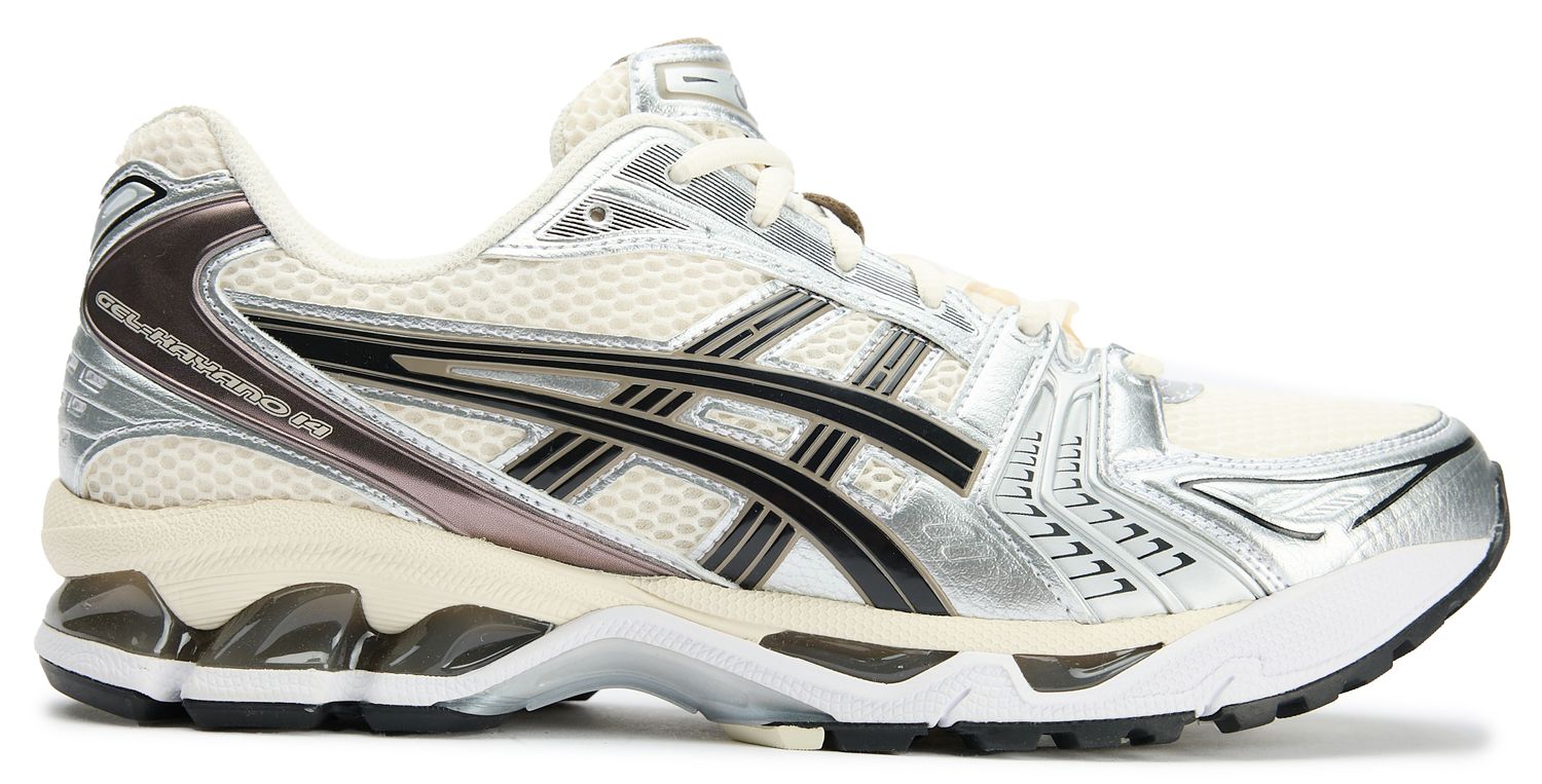 The Gel-Kayano 14 brings ASICS' iconic 2000s design language back to life with authentic tooling that runners and collectors alike will recognize. White leather and textile uppers meet silver accents across the forefront and eye stay, creating that unmistakable retro-tech aesthetic. Gel technology cushioning and a solution dye sockliner sit beneath, proving this silhouette still has the performance credentials to back up its heritage looks. A durable rubber sole grounds the design, making these trainers equally suited to daily wear or nostalgic runs.