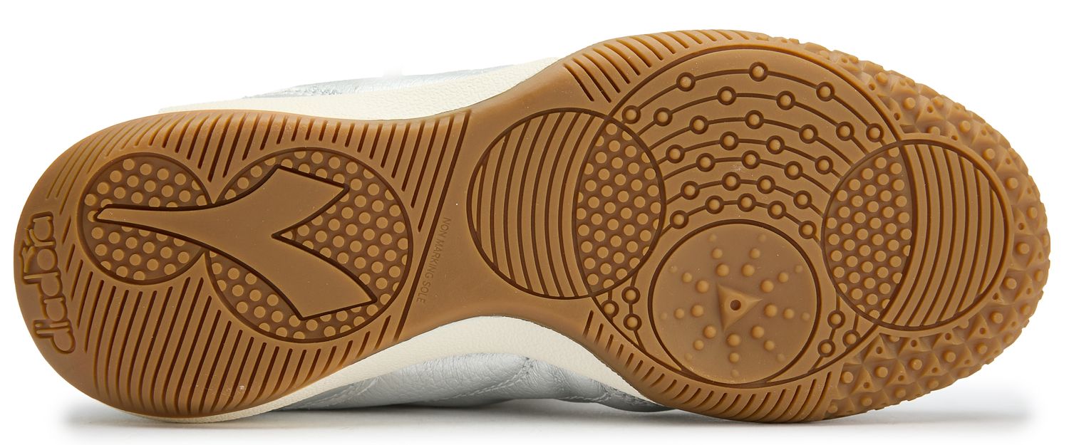 The Diadora Gold Indoor brings retro football style to everyday wear with its distinctive laminated leather upper in silver. Bold oversized branding and classic lace covers nod to the pitch, while the rubber outsole channels authentic 80s court design. A striking fusion of heritage sport and street- ready style.